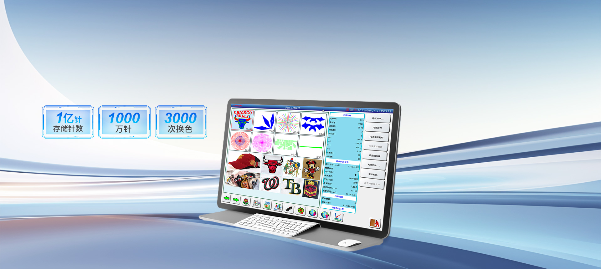 存儲針數(shù)達(dá)1億針,單個花樣可達(dá)1000萬針、3000次換色,滿足復(fù)雜花樣設(shè)計(jì)需求
