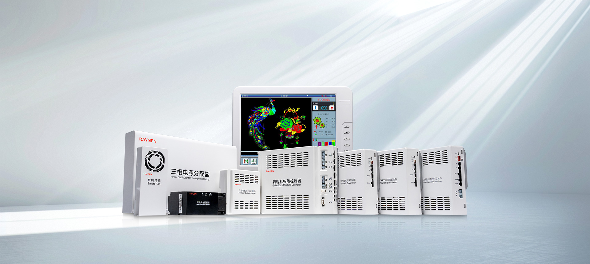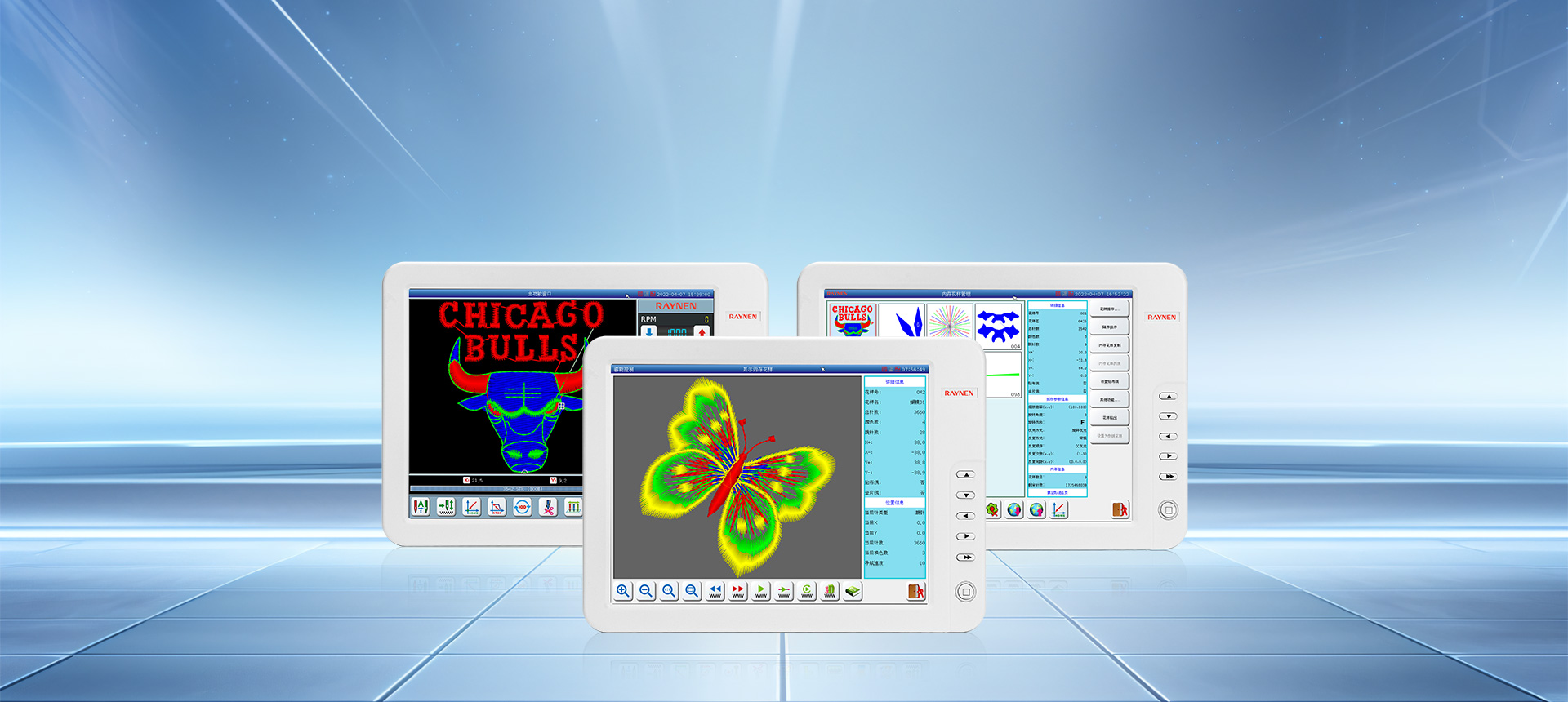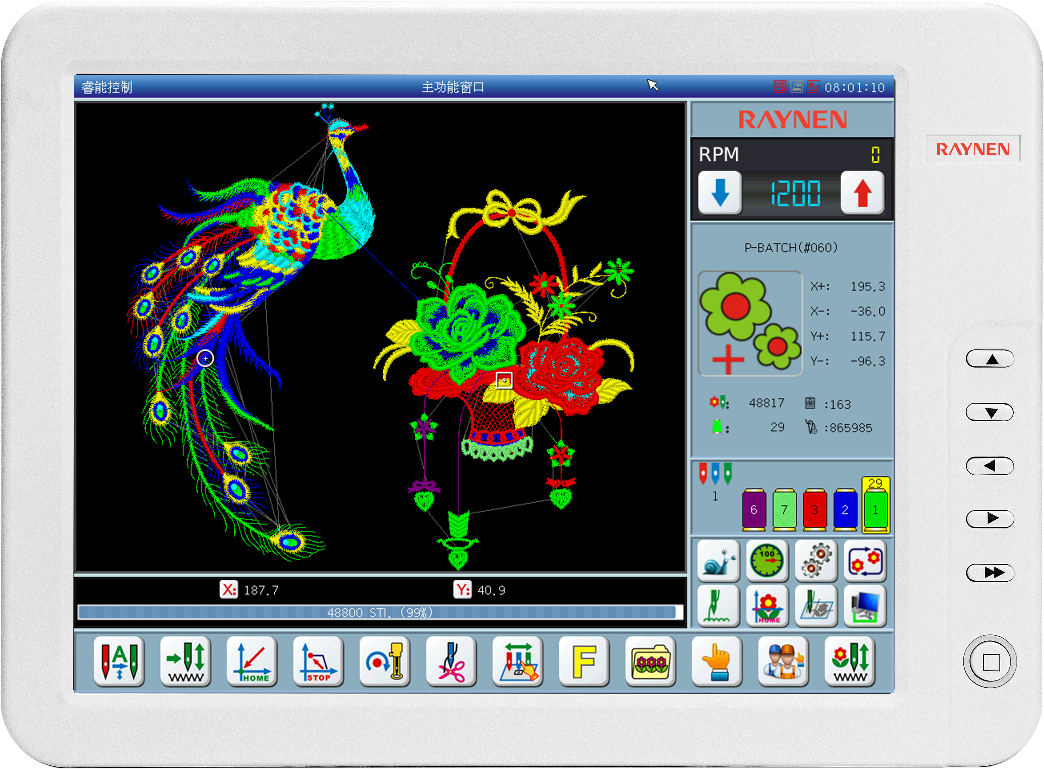 RN系列可組態(tài)平繡電腦刺繡機(jī)電控就是利用多個高端嵌入式單片計(jì)算機(jī)來搭成一個較為復(fù)雜的多軸服裝數(shù)控加工控制系統(tǒng)。通過網(wǎng)絡(luò)或USB方式,接受來自PC計(jì)算機(jī)CAD所生成的五彩繽紛花樣文件,通過X、Y平面框架、主軸Z及換色T的多軸綜合控制的數(shù)字控制系統(tǒng)來完成各種各樣花版的圖形繡作。在服裝皮革鞋帽等面料上產(chǎn)生出花樣絢麗、立體感強(qiáng)、邊角清晰的繡品。同時支持日新月異的特種繡功能,包括支持繩繡、盤帶繡、多金片繡、多疊片、散珠繡、毛巾繡、激光、熱切割、燙鉆、泡珠、雕孔繡等多種特種繡功能。